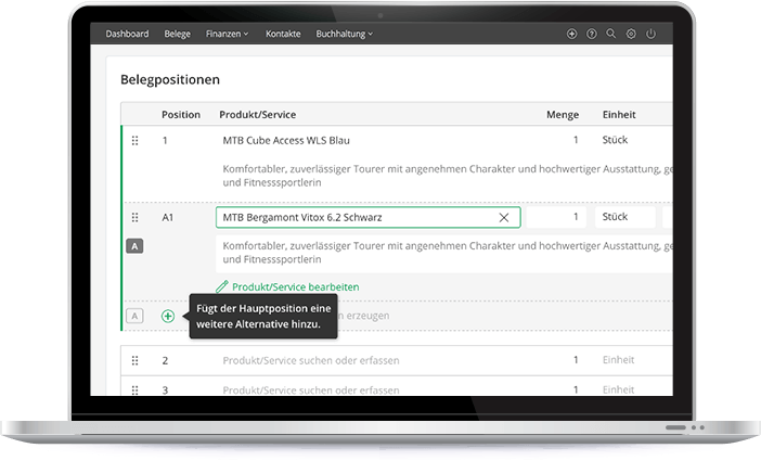 Biete deinem Kunden Auswahlmöglichkeiten durch Alternativpositionen oder ergänze optionale Positionen und Freitextzeilen.