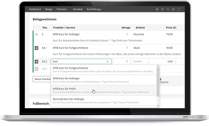 Nach drei Tagen ruft Erika an. Sie möchte die Jacke in blau bestellen und am Kurs für Fortgeschrittene teilnehmen. Alles klar, sagst du und wählst die vom Kundin getroffene Alternative einfach aus. Danach führst du das Angebot mit einem Klick weiter zur E-Rechnung. Die Auswahl wird automatisch in die Rechnung übernommen. Jetzt stehen nur noch die Positionen auf der Rechnung, die die Kundin ausgewählt hat.