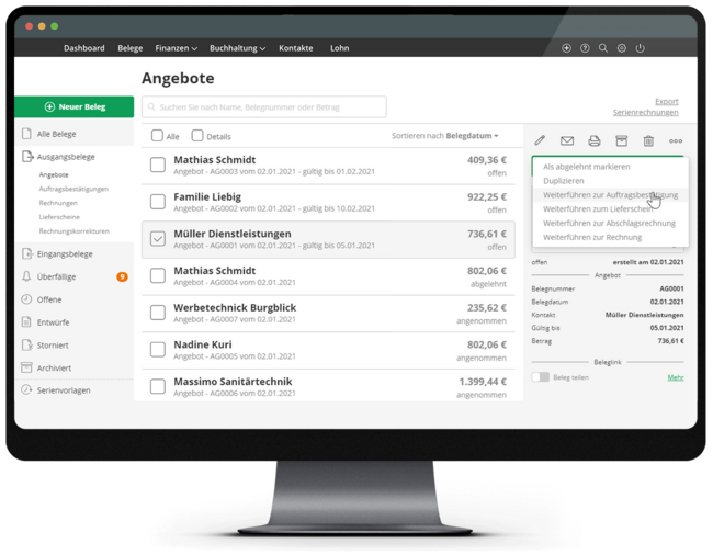 Unsere Philosophie: Mit Lexware Office erstellst und verwaltest du Auftragsbestätigungen direkt online – ohne lästiges Wechseln zwischen Formularen und Listen.