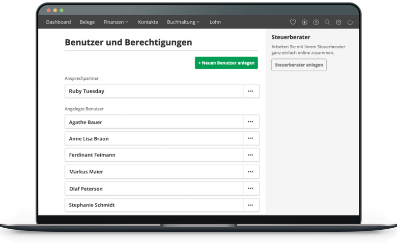 - Steuerberater einfach einbinden und gemeinsam im Programm arbeiten