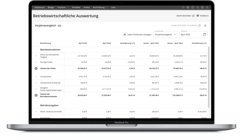 - Automatische Anpassung an deine Gewinnermittlungsart: Bilanz oder Einnahmen-Überschuss-Rechnung (EÜR)