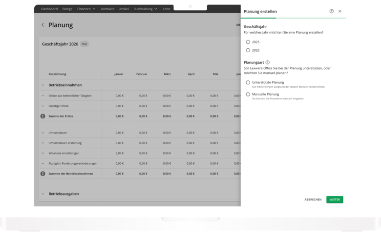 Mit Lexware Office wird Planen ganz einfach! Gestalte deine Finanzplanung nach deinen Bedürfnissen – entweder manuell oder mit smarter Unterstützung. Bei der unterstützten Planung kannst du deine Ist- oder Plan-Daten aus dem Vorjahr als Grundlage nutzen. Das Beste: Veränderungswerte werden automatisch berechnet und können von dir individuell angepasst werden. Und weil Flexibilität wichtig ist, bestimmst du selbst, wie detailliert deine Planung sein soll und über welchen Zeitraum sie läuft. So behältst du jederzeit den Überblick und planst genau so, wie es für dich am besten passt.