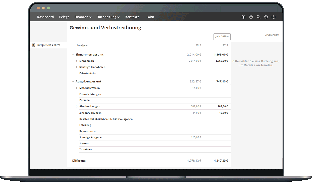Du kannst jede Einnahme und Ausgabe bis hin zum Einzelbeleg nachvollziehen. So erkennst du jederzeit, was in deiner GuV gebucht wurde. Wie detailliert der Überblick ist, hängt von der Kategorisierung deiner Belege ab, die du prüfst und unkompliziert anpassen kannst.