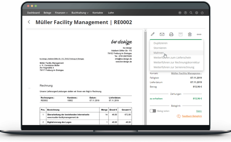 Geraten deine Kunden mit Zahlungen in Verzug, erstellst du in Lexware Office mit wenigen Klicks aus einer offenen Rechnung die passende Mahnung. Da ein Mahnbescheid ähnlich einer Rechnung nicht unterschrieben sein muss, sendest du anschließend die Forderung direkt in digitaler Form ab.