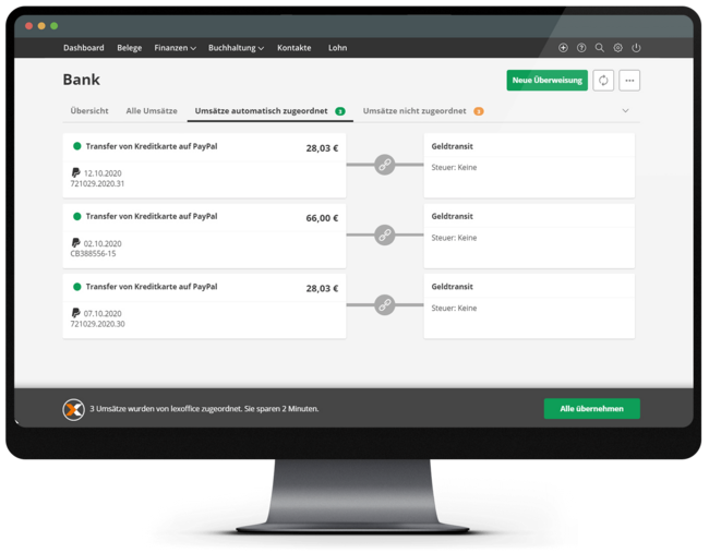 Ja, mit jeder Aktualisierung auf deinem Bankkonto kategorisiert Lexware Office die PayPal-Zahlungen automatisch. Per Klick kannst du die Zuordnungen übernehmen.