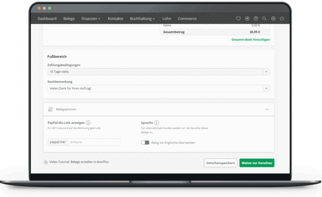 Bei der Rechnungsstellung mit Lexware Office kannst du deinen Kunden die direkte Zahlung per PayPal ermöglichen, indem du einen PayPal.Me-Link und QR-Code auf die Rechnung setzt – individuell pro Rechnung oder je nach Einstellung standardmäßig auf allen deinen Rechnungen.