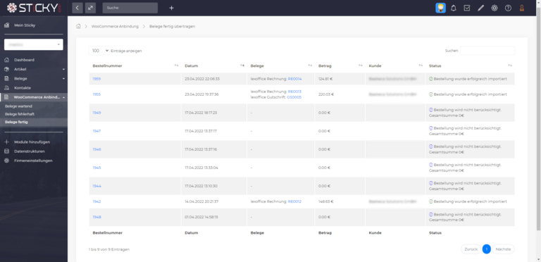 - Informationen zu erstellten Belege werden in WooCommerce-Bestellungen als Notiz angezeigt