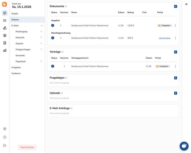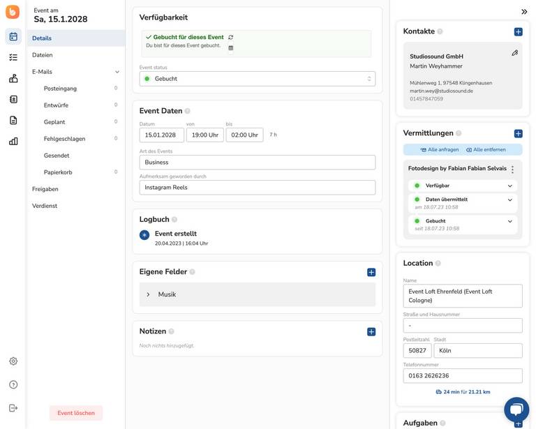 - Kundenmanagement: Hinterlege alle relevanten Daten zu Deinen Kontakten und verknüpfe sie mit Deinen Events.