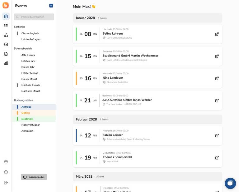 - Dienstleister-Netzwerk: Vermittle Events an Kollegen weiter, wenn du selbst nicht mehr verfügbar bist oder mit anderen Dienstleistern zusammen arbeitest.