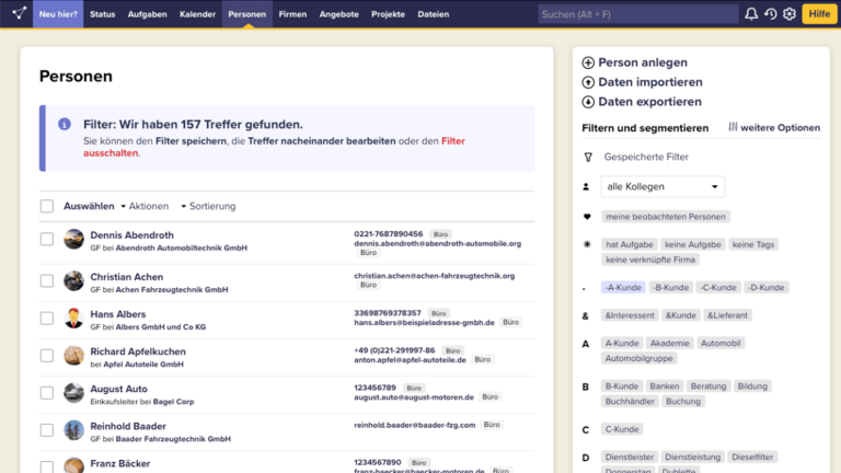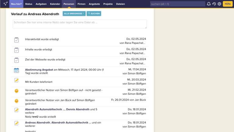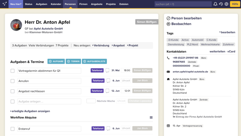 - Alle Kundendaten befinden sich an einem Ort: Adressen, E-Mails, Termine, Notizen, ToDos, Verträge, Angebote