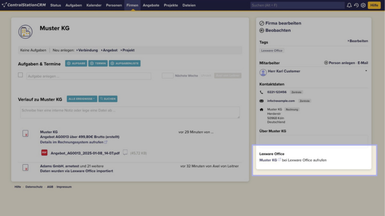 Lexware Office-Rechnungen können zu bereits bestehenden CRM-Kontakten importiert und in der Kontakthistorie angezeigt werden. Während die Integration aktiv ist, werden Angebote und Rechnungen, die in Lexware Office erstellt werden, automatisch in CentralStationCRM importiert. - Erstellung neuer Kunden in CentralStationCRM