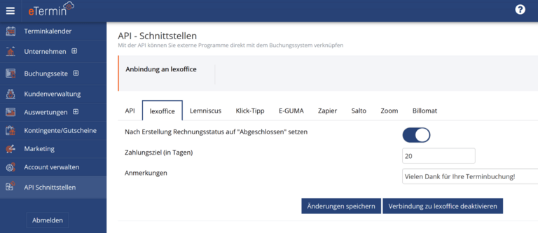 - Stelle die Verbindung in deinen eTermin Account zu Lexware Office mit deinen Logindaten her.