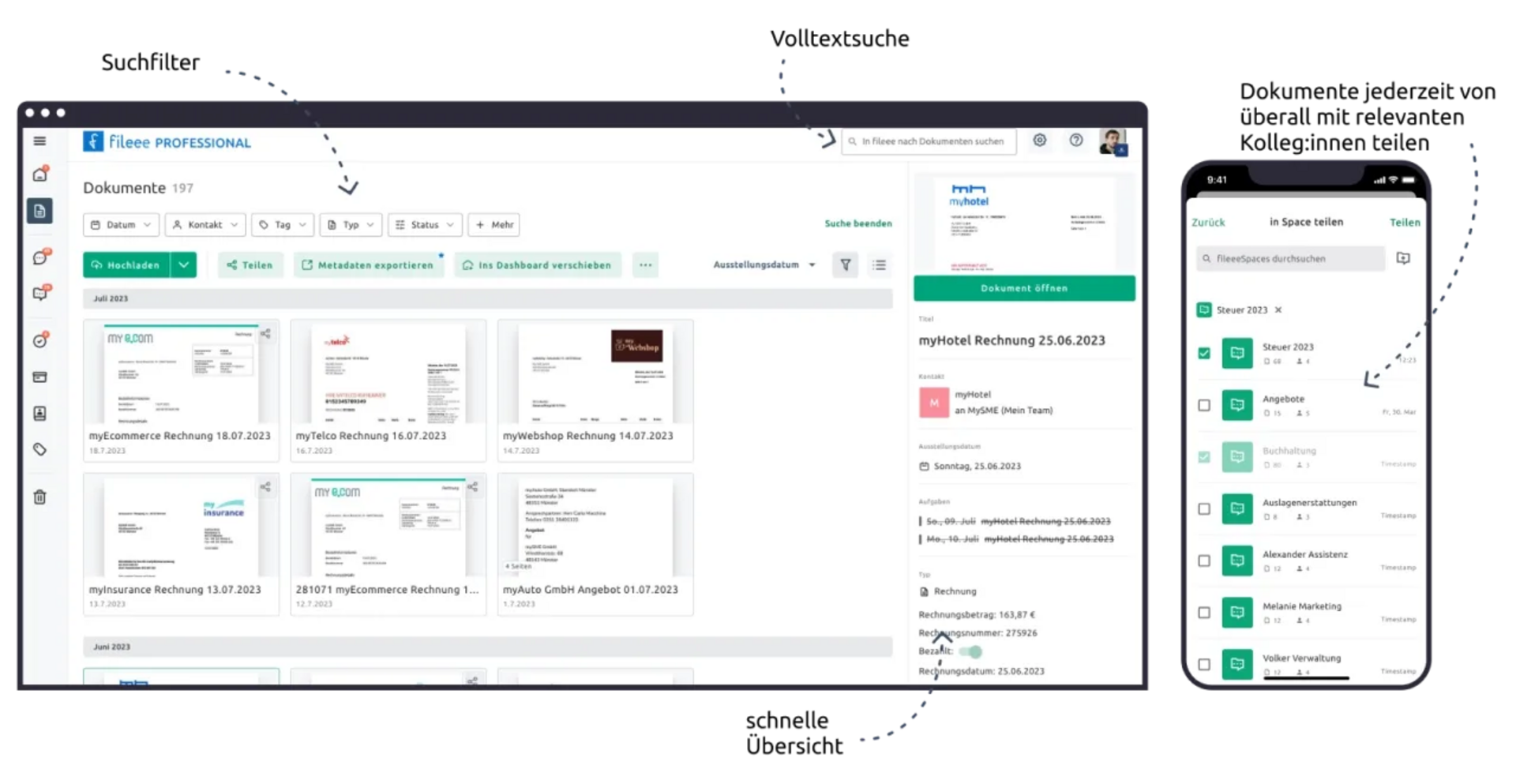 Mit fileee hast Du eine Lösung für alle Prozesse rund um Dokumente, ob Rechnung, Vertrag oder Gehaltsabrechnung. - Finde Dokumente schnell wieder und teile oder exportiere sie