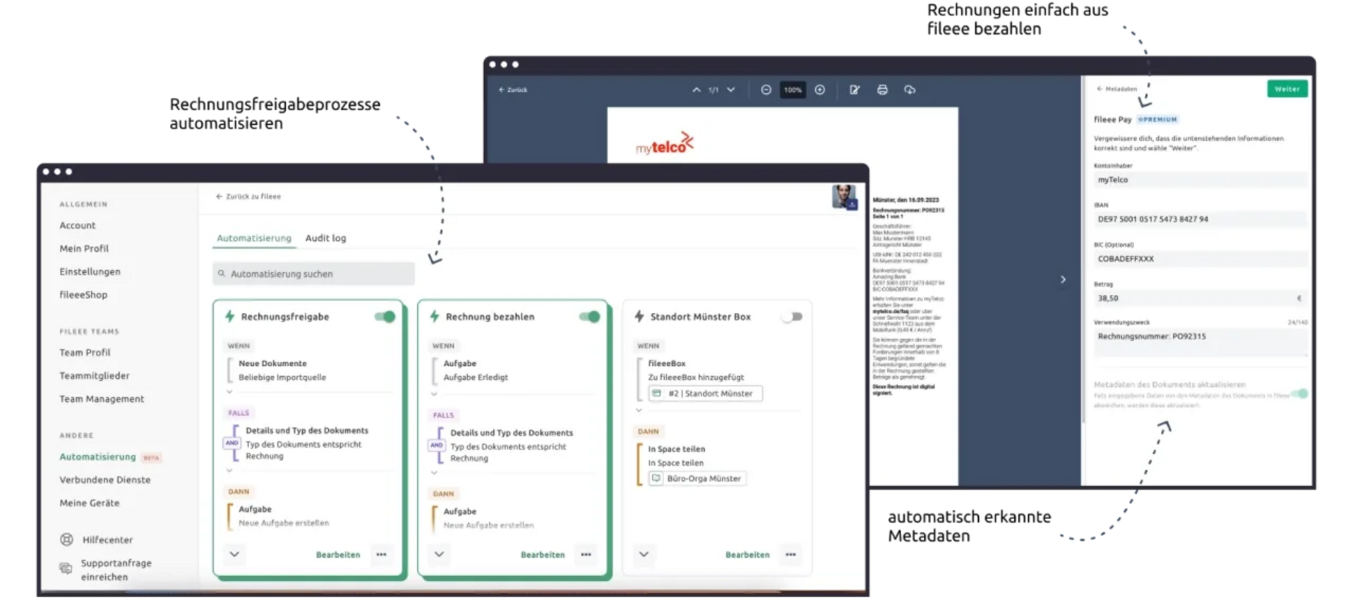 Ob Buchhaltung, Rechnungsfreigaben oder auch das sichere digitale Verfügbar machen von Dokumenten für Mitarbeitende (Arbeitsvertrag, Gehaltsabrechnungen, etc.), durch die Aufgabenzuteilung an Dokumenten und Kommunikation direkt in fileee werden viele mögliche Geschäftsprozesse direkt in fileee abgehandelt. Auch das sichere Teilen von Dokumenten an Externe oder der Export an Buchhaltungssoftware wird so ganz leicht umsetzbar.