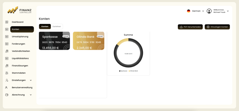 Behalte jederzeit im Blick, wie viel Geld wirklich verfügbar ist, nicht nur Umsatz, sondern echte Liquidität.