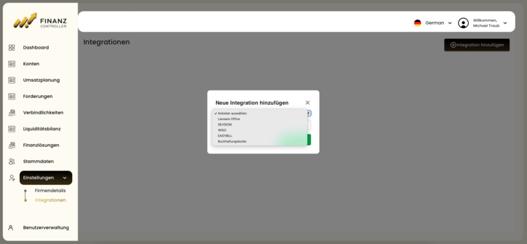 Automatische Übernahme von Rechnungen, Zahlungseingängen und offenen Posten zur Liquiditäts- und Projektsteuerung.