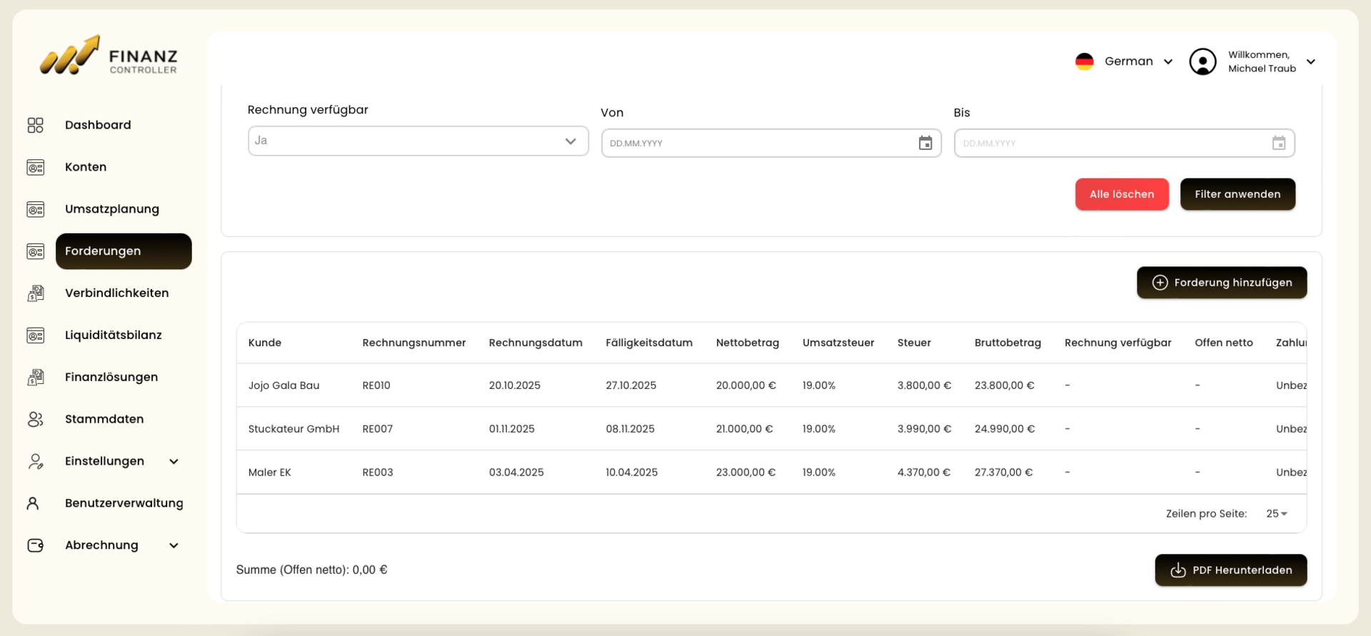 Finanz Controller ergänzt Lexware Office um eine praxisnahe Liquiditäts- und Unternehmenssteuerung für Handwerksbetriebe. Rechnungen, Zahlungseingänge und Verbindlichkeiten werden automatisch übernommen und in eine 4-Wochen-Liquiditätsplanung überführt. Mit unserer Lösung erkennen Unternehmer Engpässe frühzeitig, steuern Projekte profitabel und treffen bessere Entscheidungen – ganz ohne zusätzliche Excel-Tabellen.