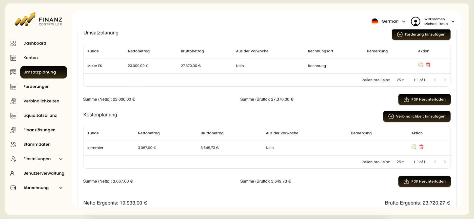 Behalte jederzeit im Blick, wie viel Geld wirklich verfügbar ist, nicht nur Umsatz, sondern echte Liquidität.