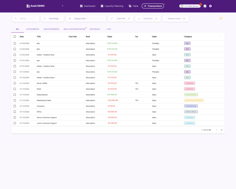 - Datenerfassung: finban sammelt Finanzdaten aus verschiedenen Quellen, wie zum Beispiel aus der Buchhaltungssoftware, dem Zahlungsverkehr, Rechnungsstellung und weiteren relevanten Systemen. Diese Informationen werden verwendet, um ein umfassendes Bild der finanziellen Situation des Unternehmens zu erstellen.