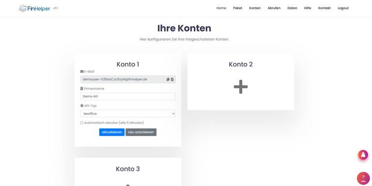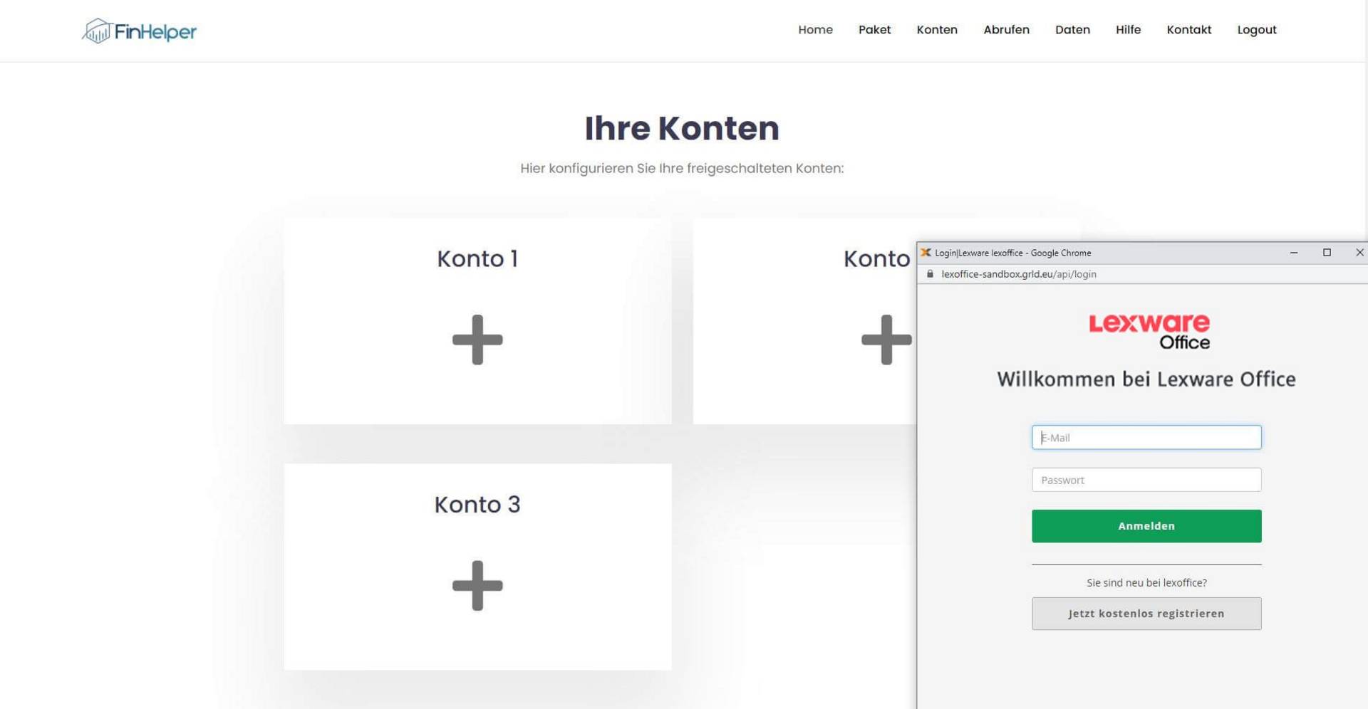 Nach der Anmeldung unter: FinHelper verknüpfe Dein Lexware Office Konto ganz einfach mit unserem Clouddienst. Danach stehen Dir die Dienste jederzeit zur Verfügung.