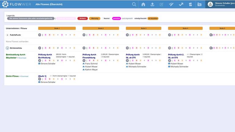 Flowwer ist eine webbasierte Belegfreigabe. Dabei sind unbegrenzt viele Freigabeprozesse definierbar mit unbegrenzt vielen Benutzern. In einem Dashboard sind mehrere Unternehmen abbildbar. Direkte Übergabe der Belege an lexoffice.