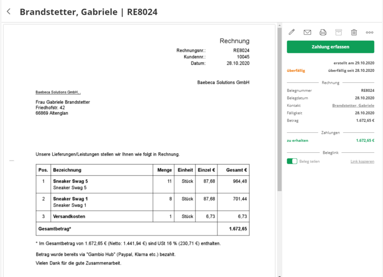 - Kunden werden in Lexware Office angelegt oder Belege bestehenden Kontakten zugeordnet