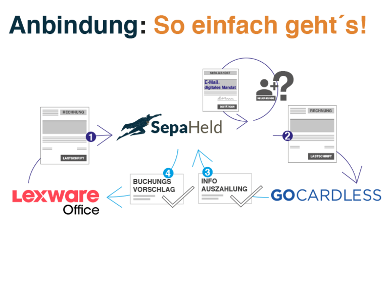 Lexware Office & GoCardless verknüpfen mit SepaHeld, um Rechnungen automatisiert zu übertragen, zu buchen und SEPA-Lastschrift-Mandate anzufordern.