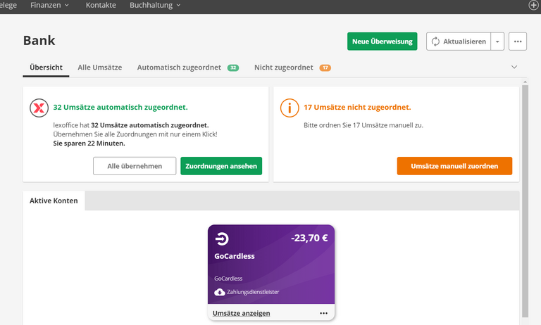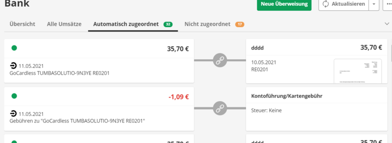 Nach erfolgreichem Zahlungseinzug durch GoCardless erstellt SepaHeld automatisch die entsprechenden Buchungsvorschläge und legt ein Transferkonto für GoCardless an. Dadurch bleibt in Lexware Office jederzeit ein vollständiger Überblick über den Status aller Rechnungen gewährleistet.