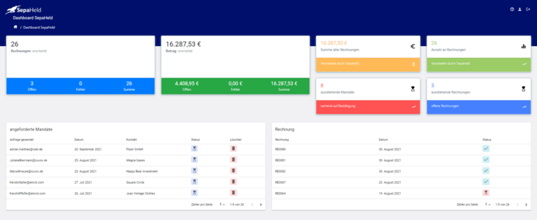 Wurde die erste Rechnung erstellt, fordert SepaHeld automatisiert bei deinen Kunden das entsprechende Lastschrift-Mandat an, sofern noch keines existiert. Sobald dieses digital erstellt wurde, werden alle Rechnungen eingezogen.