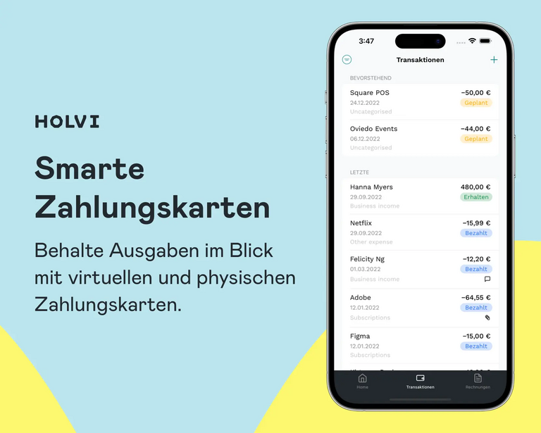 Moderne Zahlungskarten und bequemes Banking per App: Holvi macht es einfach, den Überblick über geschäftliche Einnahmen und Ausgaben zu behalten.