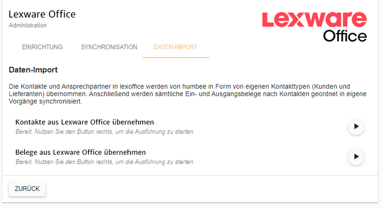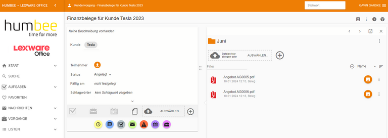 Die Integration von Lexware Office in humbee ermöglicht den automatischen Datenaustausch in Echtzeit zwischen beiden Systemen und damit die Zuordnung der Lexware Office Daten zu humbee Vorgängen oder die automatische Neuanlage von Lexware Office Daten in humbee (z.B. Kunden, Lieferanten) und umgekehrt. Ebenso werden alle Dokumente, die ein Nutzer in Lexware Office erstellt (Angebote, Auftragsbestätigungen, Rechnungen etc.) automatisch an humbee übergeben und dort den entsprechenden Vorgängen zugeordnet. Das humbee System generiert jährlich pro Kunde bzw. pro Lieferanten einen Vorgang, in dem alle Dokumente in Monatsordnern abgelegt werden.