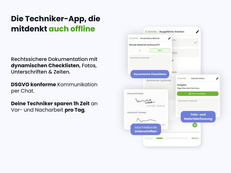 - Digitale Serviceberichte und Fotodokumentationen können vor Ort erstellt und sofort ins System übertragen werden.