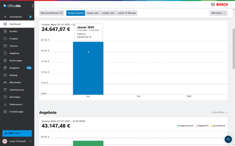 OfficeOn von Bosch ist die einfache Handwerkersoftware für Büro und Baustelle. Von der Angebots- bis zur Rechnungserstellung, Projektmanagement, Zeiterfassung und Terminkoordination. OfficeOn bietet dir alle Funktionen, die du als Handwerker in deinem Arbeitsalltag brauchst, auf einer einfachen, intuitiven Oberfläche.