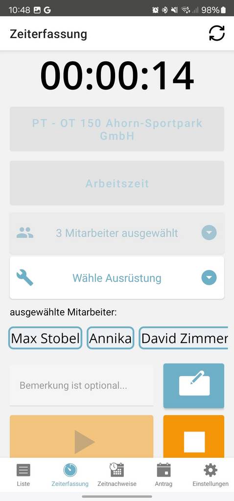 - Mitarbeiter erfassen ihre Arbeitszeit (optional mit GPS) bequem in der App.