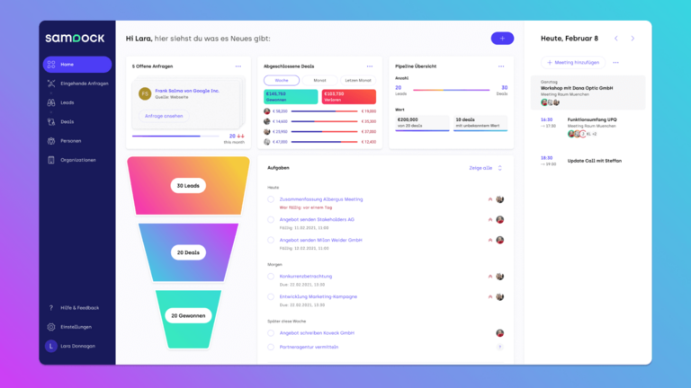 So viel Spaß hat Vertrieb noch nie gemacht: Samdock ist das einfachste CRM-System für kleine Unternehmen unterstützt dich dabei, deine Vertriebsabläufe perfekt zu strukturieren, deine Kontakte und Kunden nicht nur sehr gut zu kennen, sondern auch intuitiv zu segmentieren und deine täglichen ToDos und Termine im Team einfach zu organisieren.