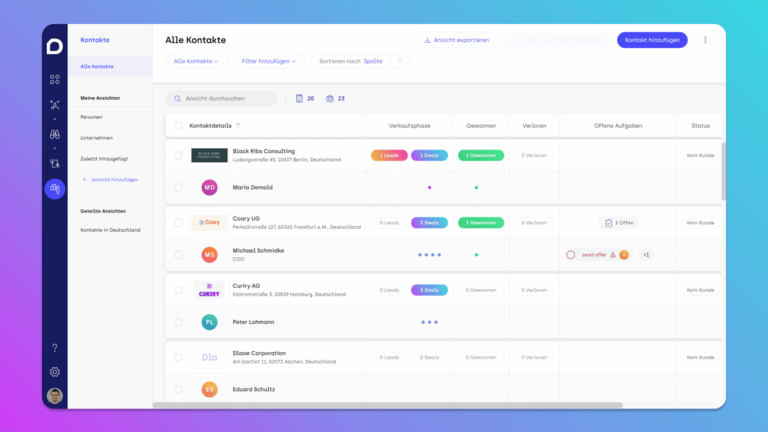 Samdock ist ein deutsches CRM-System mit Firmensitz in München. Die cloudbasierte Software hilft kleinen Unternehmen und Vertriebsteams, ihr Kundenmanagement und ihre Vertriebspipeline strukturiert und effizient zu managen.