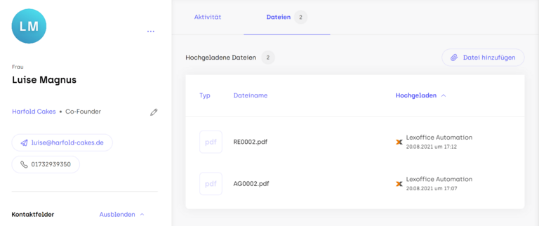 - Alle Angebote und Rechnungen werden automatisch am richtigen Kontakt als PDF angehängt, sowie chronologisch in der Kontakthistorie erfasst.