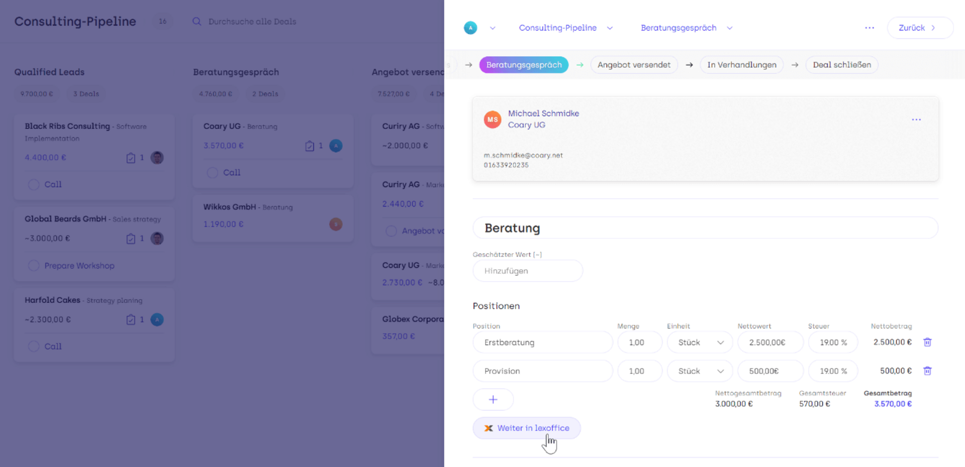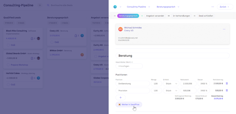 - Mit nur einem Klick oder per Drag & Drop löst du ein Angebot oder die Rechnung in Lexware Office aus – alle Positionen und Kontaktdaten werden automatisch übernommen. Du brauchst das Dokument nur noch zu versenden.