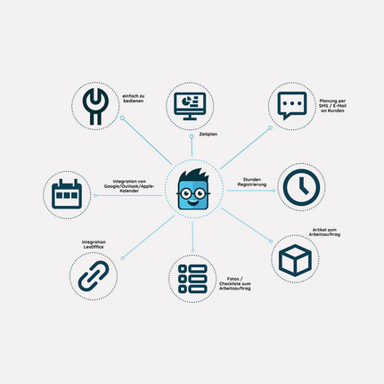 Von diesem zentralen Punkt aus kannst du ganz einfach Arbeitsaufträge erstellen und planen, Kundendaten verwalten und Materialien hinzufügen. Das Office-Modul synchronisiert sich in Echtzeit mit der App deiner Mitarbeitenden im Außendienst – so sind alle Informationen immer aktuell, egal ob es um neue Termine oder Änderungen geht. Das ständige Hin- und Hertelefonieren bei Änderungen gehört damit der Vergangenheit an.