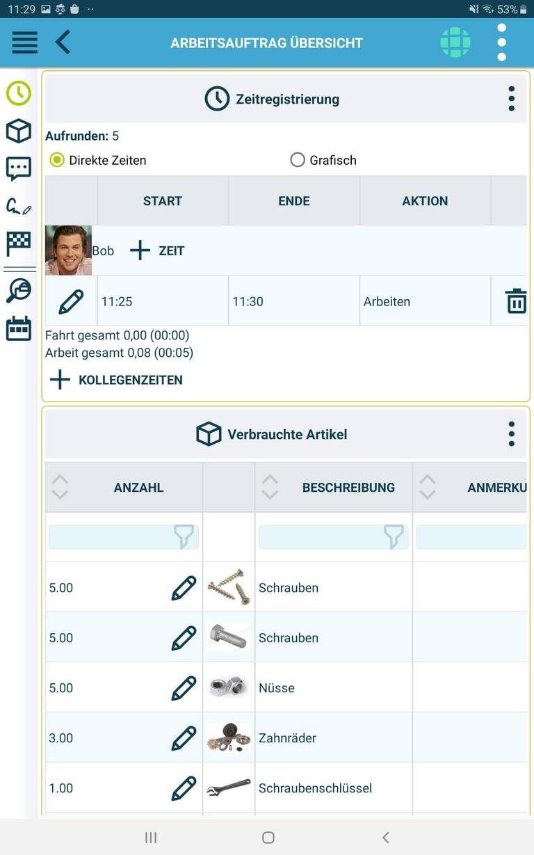Als Außendienstmitarbeiter kannst du geplante und neue Arbeitsaufträge direkt aktualisieren und abschließen. Verwende die App (Feldmodul), um deine Planung einzusehen, zur Arbeitsadresse zu navigieren, Arbeitszeiten und Pausen zu erfassen und den Materialverbrauch zu dokumentieren.