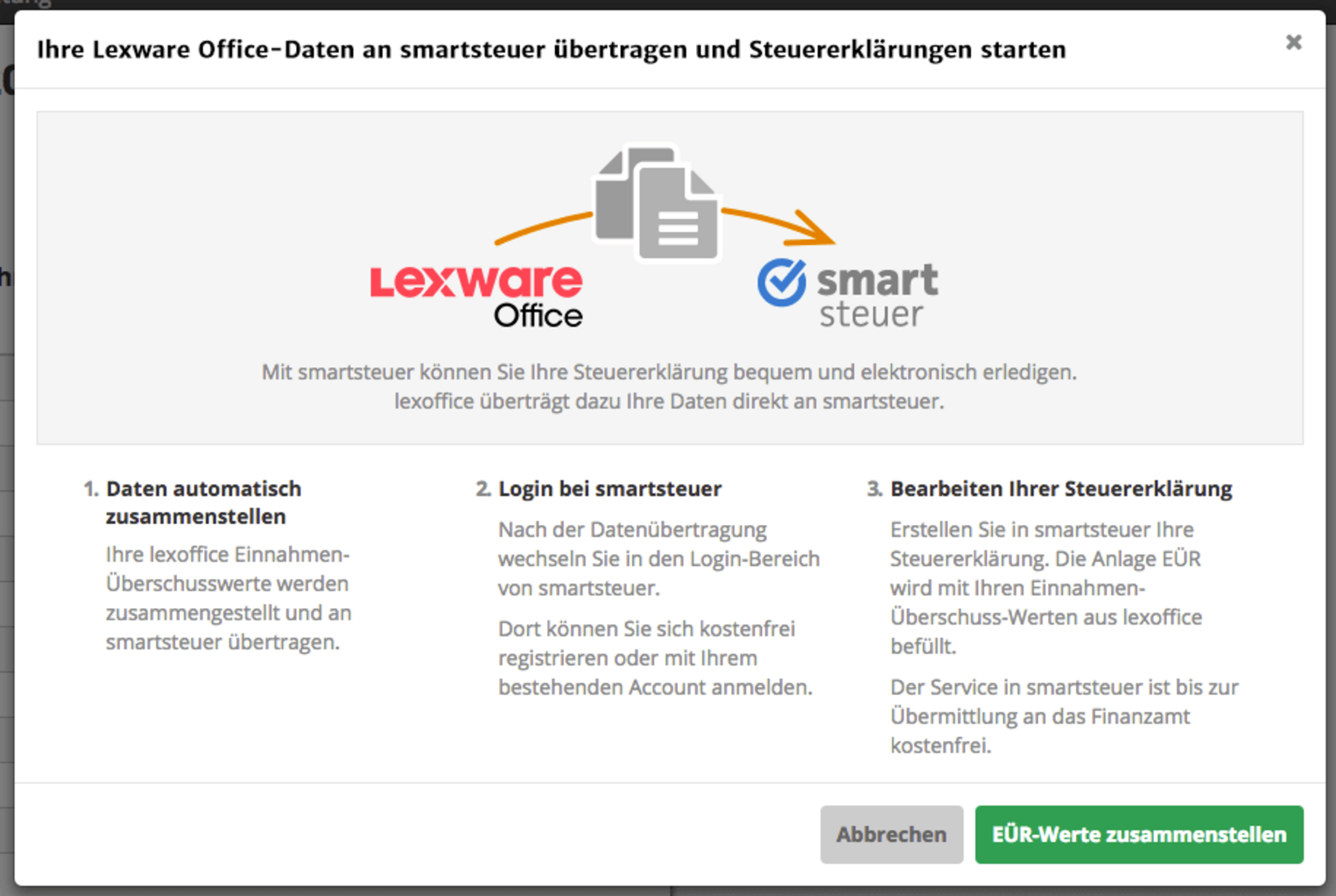 - Klicke auf „EÜR-Werte zusammenstellen“ und Steuererklärung mit smartsteuer starten