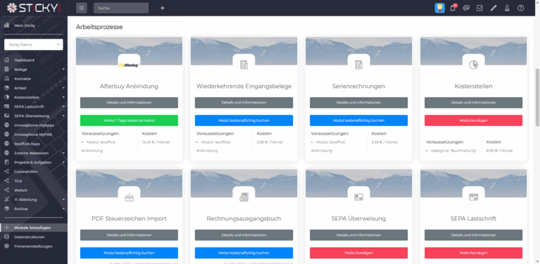 Sticky Module: Neben den Basismodulen gibt es diverse Zusatzmodule, um die täglichen Arbeitsabläufe zu vereinfachen. Jedes Modul ist einzeln buchbar und kann im Vorfeld sieben Tage kostenlos und unverbindlich getestet werden.
