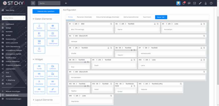 Sticky ist eine Cloud-Anwendung, um Arbeitsprozesse in allen Bereichen zu automatisieren, tägliche Arbeiten zu vereinfachen und zu zentralisieren. Sticky ist für alle Branchen und Betriebsgrößen geeignet. Das Basissystem besteht aus gängigen Grundbausteinen wie z. B. die Kontakt- oder Artikelverwaltung. Mit Sticky können aber auch ganz individuell eigene Datenstrukturen angelegt werden, sei es für die eigene Fahrzeugflotte oder für die Verwaltung von Immobilien. Je nach Bedarf und internen Abläufen können passende Module für verschiedene Aufgabengebiete, z.B. das Erstellen von Serienrechnungen und das Erfassen von Kostenstellen, gebucht werden. Spezialanwendungen wie Schnittstellen zu externen Programmen oder eigens zugeschnittene Module entwickeln wir gerne individuell und ganz nach Deinen Wünschen.