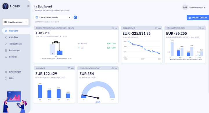 Das Tidely Dashboard ist Ihre persönliche Schaltzentrale für den finanziellen Erfolg. Hier finden Sie passend zu Ihrem Geschäftsmodell Informationen in Echtzeit über alle Cash-relevanten Vorgänge. Stellen Sie Ihr individuelles Dashboard mit den relevantesten Liquiditätskennzahlen zusammen.
