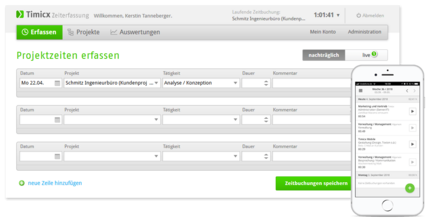 Als Cloud-Lösung kannst du Timicx im Browser überall online nutzen, egal ob im Büro oder bei deinen Kunden vor Ort. Unsere mobile App ermöglicht dir die komfortable Bedienung am Smartphone. - Stundensätze und Kostenrechnung