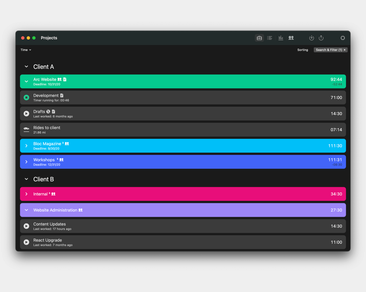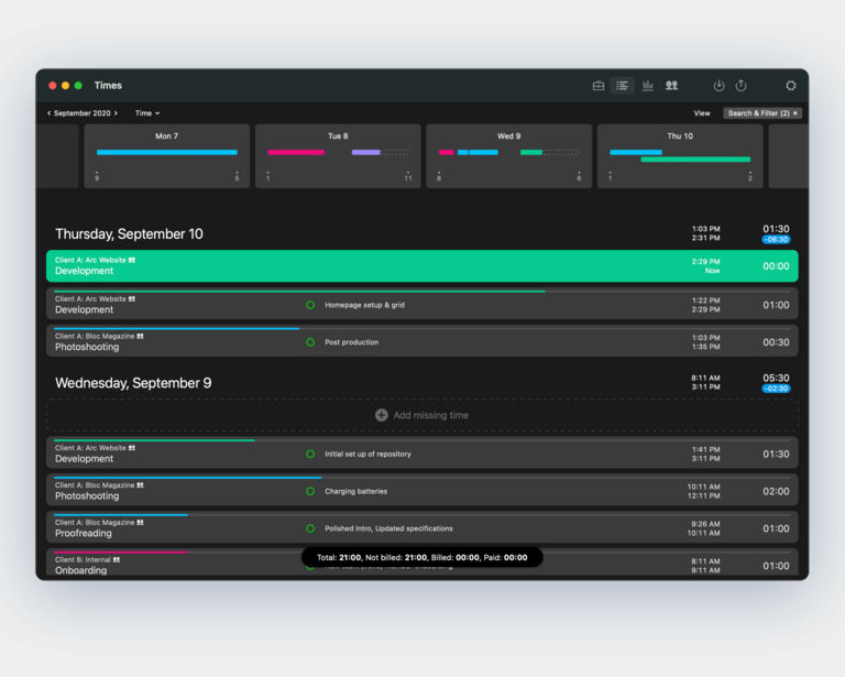 Tyme ist ein einfaches, aber mächtiges Zeiterfassungstool für Freelancer und Teams. Du erhältst einen schnellen Überblick über den Stand deiner Projekte, deine Abgabetermine und deine Auslastung – immer synchron auf all deinen Apple Geräten.