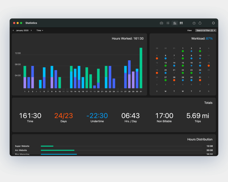 - Übersichtliche Statistiken zur Kontrolle Ihrer Auslastung und Arbeitszeiten, Abgabetermine und Prognose für die nächsten Wochen