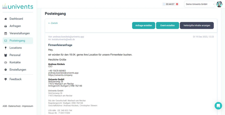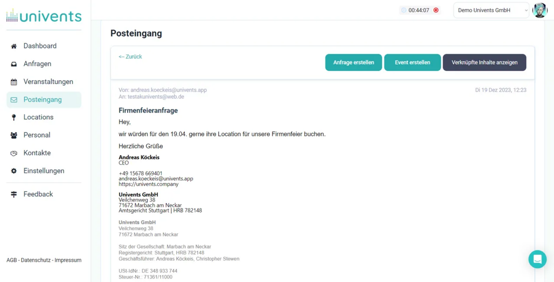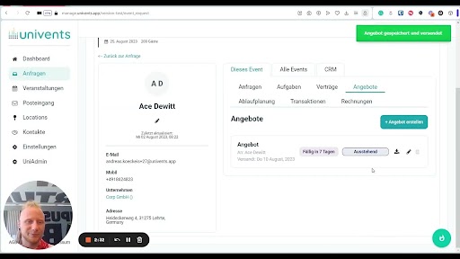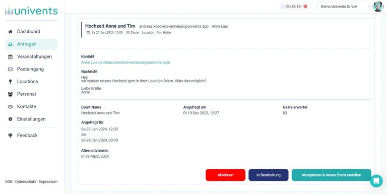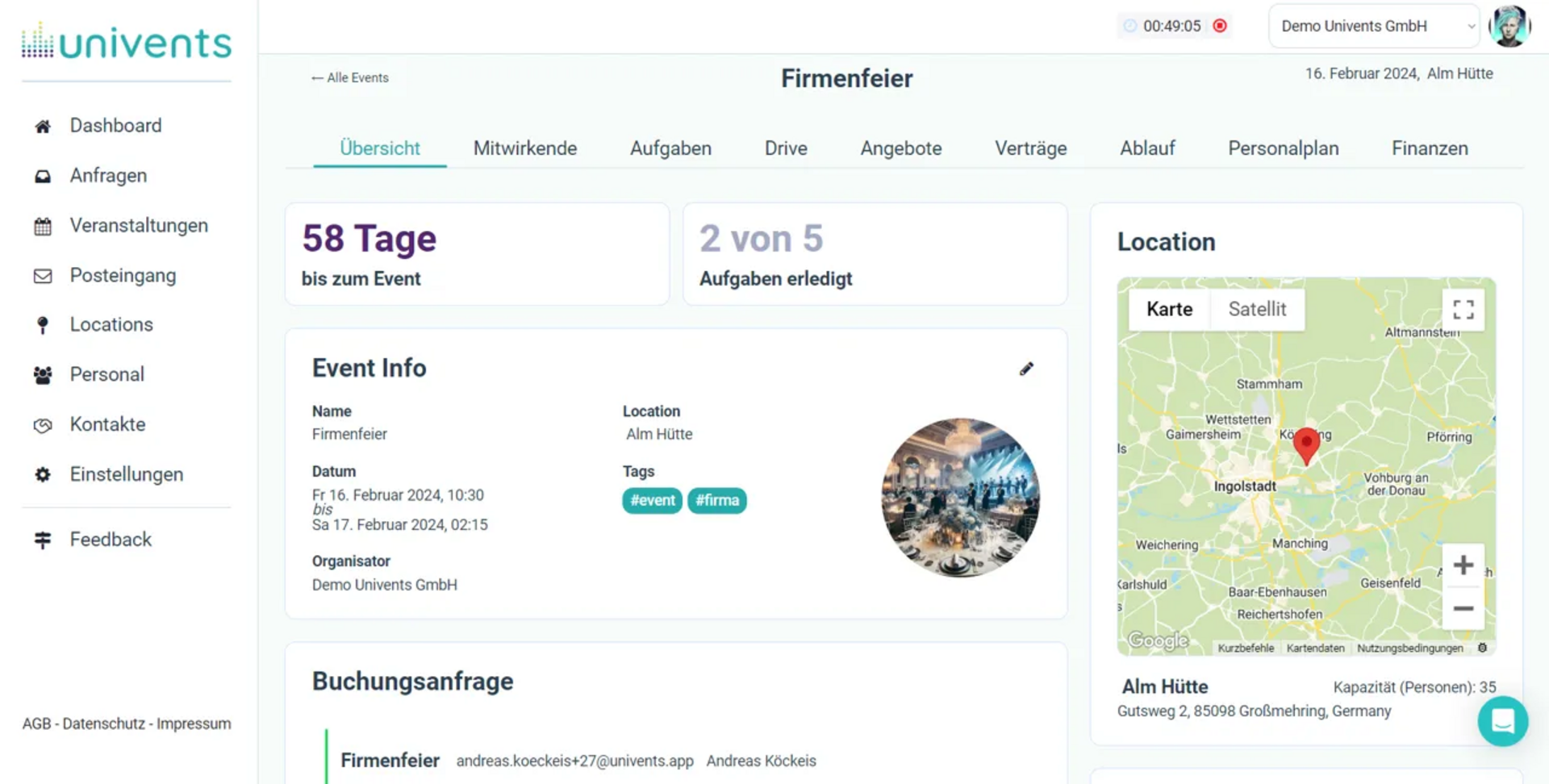Univents bietet mit seiner Softwarelösung ein umfassendes Event-Management-System, das Event-Agenturen und Veranstaltungsorten dabei hilft, effizienter zu arbeiten. Bis zu 47% Arbeitszeit kann pro Mitarbeiter:in eingespart werden, indem zahlreiche Aufgaben, die zuvor manuell bewältigt wurden, automatisiert und in einer Plattform zusammengeführt werden. Die Software ermöglicht es, Buchungsanfragen zu verwalten, Kundenkommunikation zu vereinfachen und Event-Details, Tickets und Gästelisten zentral zu managen.