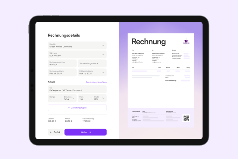 - Rechnungen & Zahlungen – Erstelle und versende Rechnungen, verfolge Zahlungen und ordne Belege.