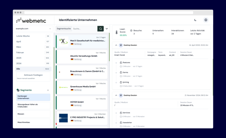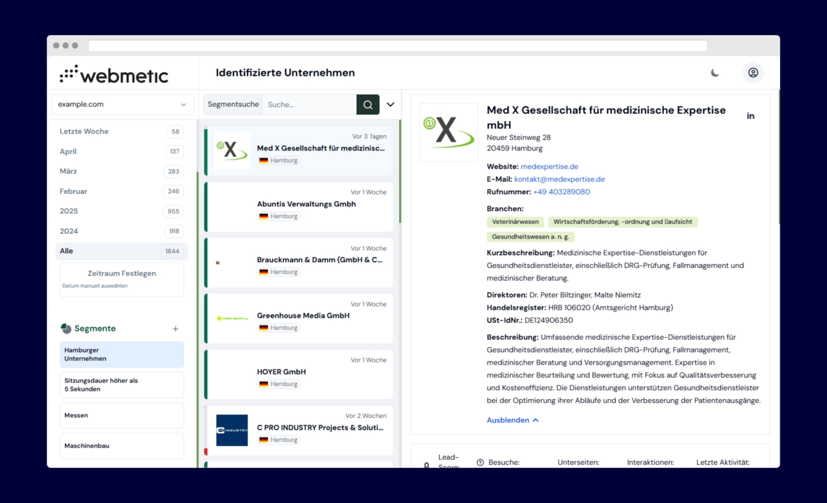 Unsere proprietäre Technologie erkennt Unternehmensbesucher auf deiner Website in Echtzeit – vollständig DSGVO-konform und ohne Einwilligungspflicht. Du erhältst detaillierte Informationen wie Unternehmensname, Branche (NACE-Code), Standort und weitere Firmendaten, die für deine Buchhaltung und Vertriebsprozesse wertvoll sind.